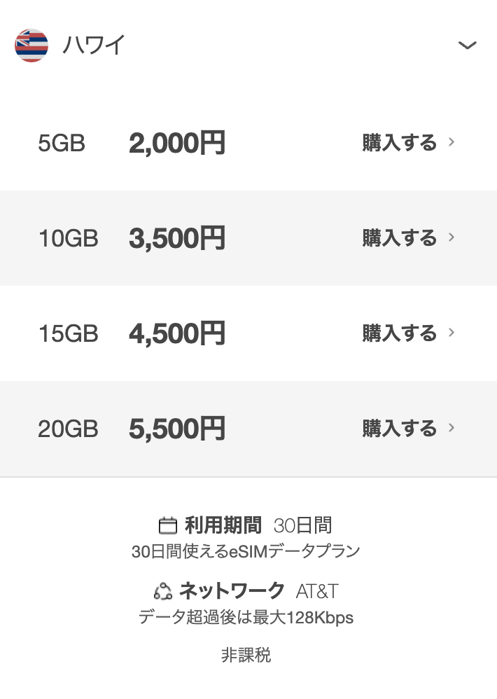 ハワイ対応のeSIMプランは、データ容量別に3種類。